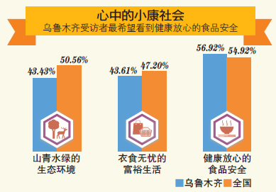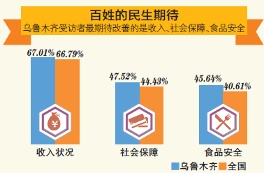和全国受访者一样,乌鲁木齐受访者感到在收入、养老和医疗方面存在民生困难,其中在住房和子女教育方面的民生困难也比较突出,“健康放心的食品安全”是大家最大的期待。