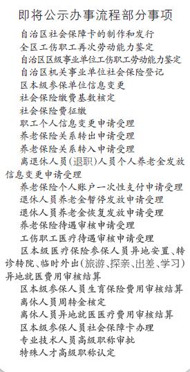 其中,劳动就业公共服务事项包括自治区普通高中等学校毕业生报到派遣、职业资格证书核发、用人单位劳动用工备案、外来务工就业服务等15项;社会保障公共服务事项包括:单位职工退休审批和工龄认定、自治区社会保障卡制作和发行、养老保险关系转入申请受理、各类保险待遇审核受理等50项;人事人才公共服务事项包括:专业技术人员继续教育证书颁发、特殊人才高级职称认定、自治区博士后自主经费评审等26项;其他公共服务事项包括:申请政府信息公开、劳动人事争议仲裁案件处理、信访接待处理等8项。