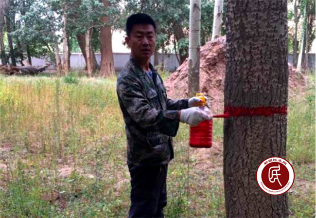 (图为白玺为树木“穿衣戴帽”)