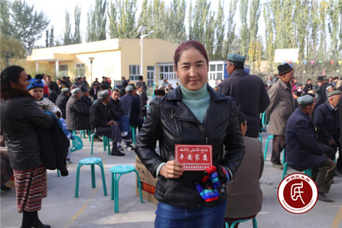 图:村民图迪古丽·艾则孜领取了“平安家庭”门牌