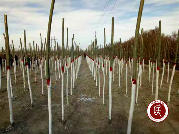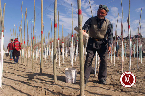 农民给树苗刷石灰水