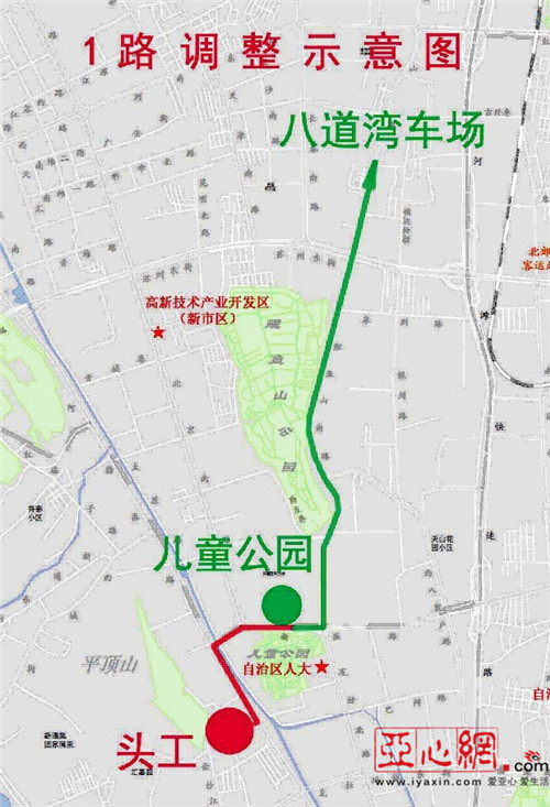 1路首末站儿童公园至八道湾公交车场,线长13.2公里,配车23辆。调整后首末站调整为头工至八道湾公交车场,新增新医路、阿勒泰路,线路延伸1.4公里,延伸后线路全长14.6公里。