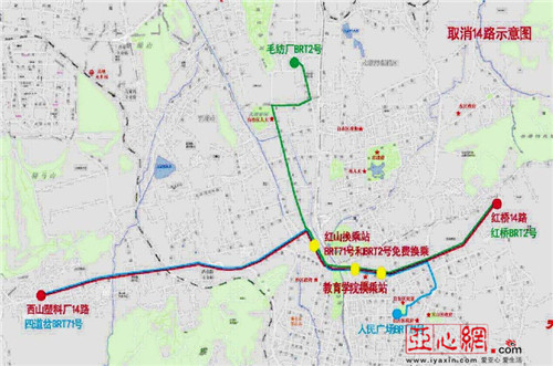 14路由西山塑料厂至红桥,线长13.3公里,配车60辆。由于该线路公交车西山塑料厂至光明路与BRT71号线重复,光明路至红桥路段与BRT2号线重复,故取消14路,由BRT2号线、BRT71号线替代服务,红山站为同台换乘站。调整时间:2019年6月29日(星期六)00:00。