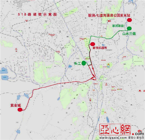 518路由紫金城至七道湾蔬菜公园,线长31公里,配车29辆。调整后为2条线路,分别是3201路由紫金城至家佳乐超市和518路由头工至河马泉新区。