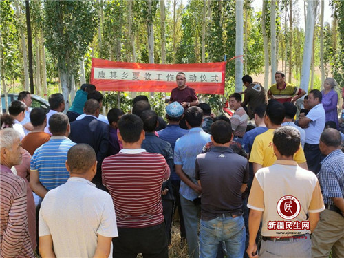 康其乡党委副书记、乡长依买尔·阿布拉强调:“近年来,乡党委、政府高度重视’三农‘工作,认真贯彻落实自治区、地区、县委、政府的各项方针政策,坚持不懈地抓好农业生产,并多次组织开展科技人员下乡包村活动,齐心协力战田间,团结一致保丰收,夺取了来之不易的夏粮生产好局面。如果近期没有突发性自然灾害,我乡冬小麦、夏粮生产有望丰收。因此,组织好粮食收割工作是确保丰产丰收的关键一环。我们将积极协调农业、农机、气象、交通等有关部门搞好各项服务,全力做好农业机械的组织调度、技术维修、物资供应、交通维护等工作,为夏粮收割提供强有力的支持,确保收割机、打包机一路畅通,确保夏粮生产‘颗粒归仓’!”