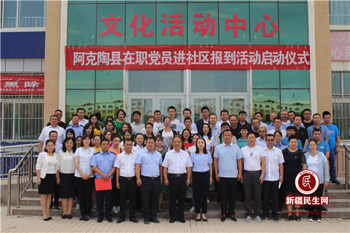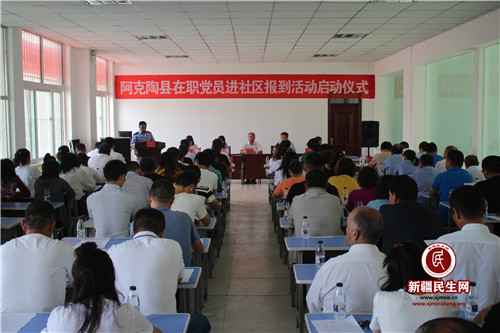 新疆民生网(陈昱)为深入贯彻落实习近平总书记在“不忘初心、牢记使命”主题教育工作会议上的讲话精神,纪念中国共产党成立98周年、新中国成立70周年,6月28日上午,阿克陶县在职党员进社区报到活动启动仪式在慕士塔格路社区举行。阿克陶县委常委、阿克陶镇党委书记赵斌出席启动仪式并讲话。县机关工委书记谭玲出席启动仪式。社区党委书记吕兴波主持启动仪式。各县直机关党支部负责人、在职党员代表等110人参加启动仪式。
