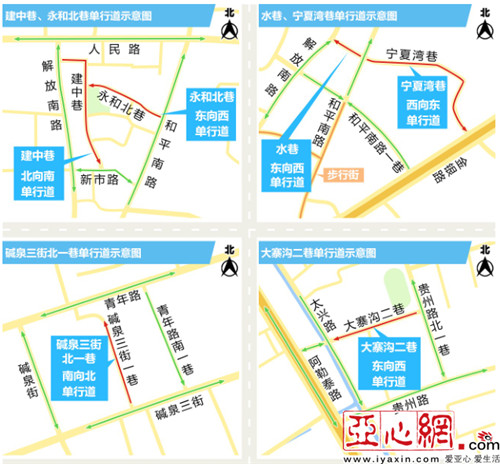 五、碱泉三街北一巷(碱泉三街至青年路之间路段)设置为由南向北方向的单行道,禁止车辆由北向南方向行驶。