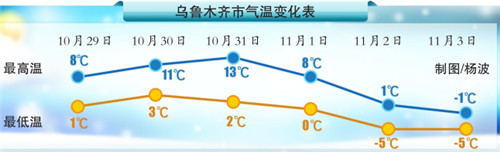 降雨结束后,首府中心城区的气温会接连两天小幅回升,10月31日的最高温将升至13℃,直到11月1日第二场冷空气到来,低温从0℃降至零下。从10月28日监测来看,到了11月2日,首府中心城区的日最低温会降至-5℃左右,并伴有雨雪天气出现。