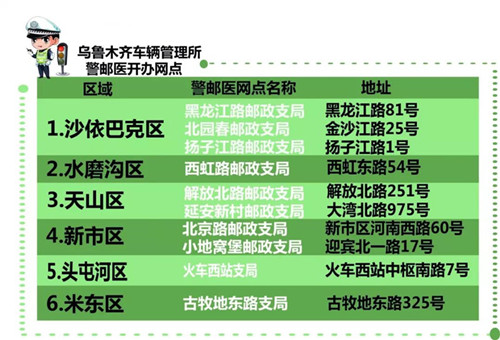 目前,乌鲁木齐市共有10家警邮医服务网点和10家警保服务网点。这20家网点的办理业务时间为:周一至周五10时—18时。