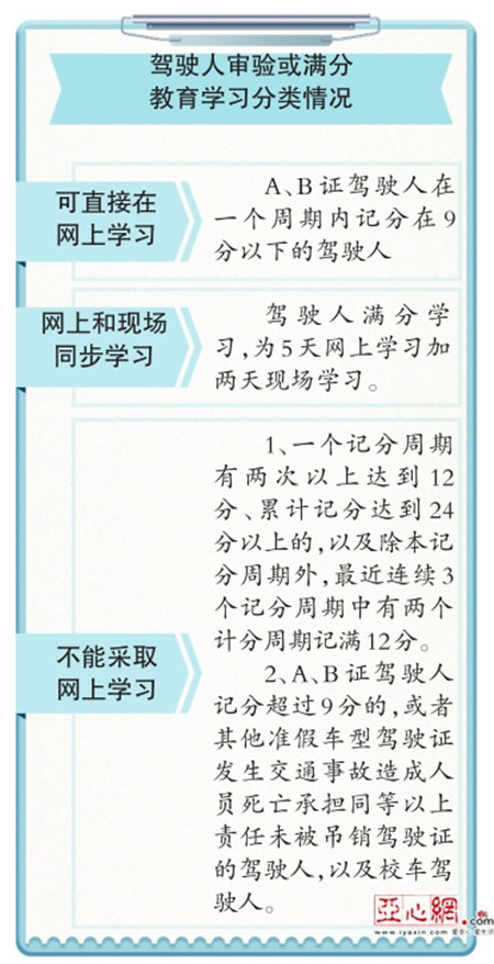 第一种是持A证和B证的驾驶人在一个记分周期内有记分且尚未达到12分的,持有其他准驾车型驾驶证发生交通事故造成人员死亡承担同等以上责任未被吊销驾驶证的,以及校车驾驶人;第二种是驾驶人满分学习,在一个违法记分周期内累计分达到12分及以上的机动车驾驶人。