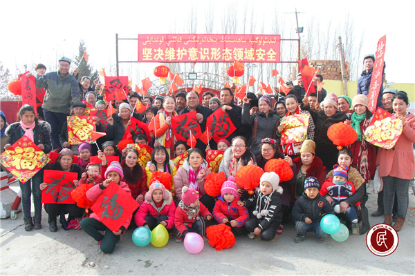 党员干部和各族群众手持春联、福字和灯笼一起合影,留下着珍贵的瞬间,气氛十分热烈。
