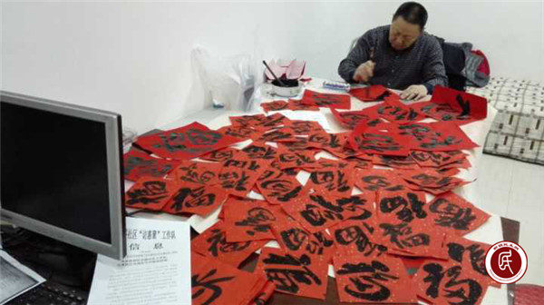 图为乌鲁木齐市水务局住仓盛社区工作队队长许凤林忙着为居民赶写“福”字