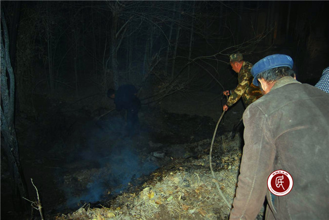 当晚9点40分左右,该村住村工作组在接到村警务室通知后,立即与警务人员和村干部赶赴火灾现场。由于树林旁有村民居住,所以情况十分紧急,工作组到达现场后立即分工:一方面组织周边村民对明火区用铁锨进行沙土覆盖,另一方面安排人员从就近农户家中接水管引水扑火,工作组成员和村干部、警务人员一起加入其中,奋力救火。经过近一个小时的紧张灭火后,火势得到控制,随后用水管对火场进行清查,直到火星完全扑灭后,工作组才离去。所幸事故没造成人员伤亡及巨大损失。