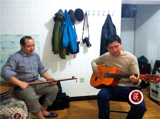 工作组宿舍自娱自乐,阿布都瓦依提教授弹唱莫斯科郊外的晚上(左边 买买提江·艾依提老师 右边 阿布都瓦依提·尼亚孜老 苗玉青供图)