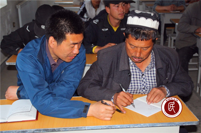随后,工作组成员阿布力克木给大家讲了一个多小时的课,下课后:小队长用生硬的汉语给工作组成员讲“您好”,工作组成员开心的对小队长说“亚克西穆斯孜”。