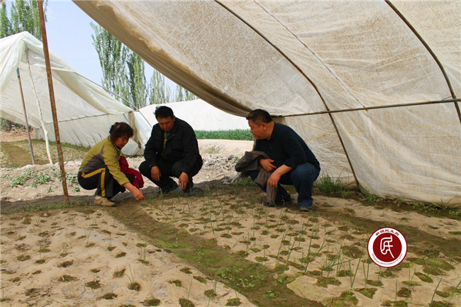 村里正在召开“三位一体”会议 工作组成员与村民一起看洋葱苗的长势