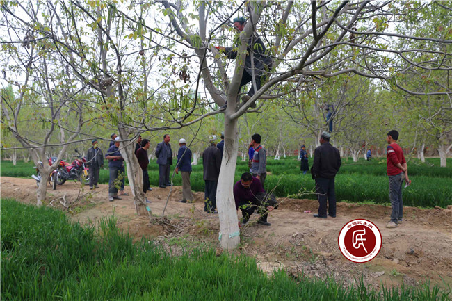 村党支部书记艾力·吾斯曼和村民买合木提·吾斯曼两位“专家”老师拿起修剪工具,边讲解边示范,用心地传授如何甄别更新老弱枝条;如何控制生长,改善树冠结构,提高光照和空间利用率,扩大结果范围,培养树体牢固的骨架;如何调节树势,疏剪枝条,通风透光,促进开花结果,保持生长结果相对均衡协调……,通过修剪整形能使幼树适龄结果,成年树盛果期延长,老树更新复壮。