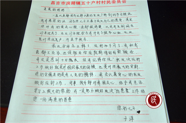 母亲节将至,昌吉市社保局住滨湖镇五十户村工作组员于洋写下了这样的一封信“亲爱的妈妈,一直以来都没有这样认真的在这个特别的节日里说出我感恩的话,因为您儿子不善于表达自己的感受,其实你对我的爱我心里一直都很清楚,最近身体怎么样了,住村两个多月了,我和爸都不在家,也没能在你住院期间好好照顾你,我还是感到十分愧疚,但我记得你说把这次住村工作做好就是对组织最大的回馈,也是对您最大的安慰……”于洋用最传统的方式、最朴实的言语表达对妈妈的牵挂。