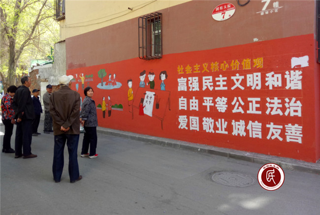 新疆民生网讯 (通讯员 刘振)有一种文化叫社区文化,它是打造城市文化建设的重要组成部分,它为市民休闲注入了思想文化的内涵,为宜居昌吉熔铸了精神的内容。昌吉市延安北路街道团结院社区工作组通过对社区楼栋墙体进行改造,把社区内一面面水泥墙变成了美观而又会“说话”的民族团结文化墙, 图文并茂、色彩鲜艳的文化墙不仅成为了社区温馨、亮丽的一道风景线,同时也引来众多居民驻足观看,成为社区宣扬民族团结的新“窗口”。