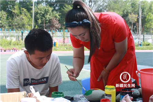 随后,志愿者服务队在幼儿园老师的带领下,分成两组,一组帮助老师做石头彩绘,一组手工缝制沙包。许多志愿者都是第一次接触针线,在老师的指导下,许多志愿者学会了如何缝制沙包。
